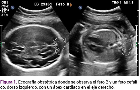 Debido a las altas tasas de complicaciones en los embarazos gemelares se indicó un control ecográfico estricto. El Doppler fetoplacentario y la ecografía obstétrica de la semana 29 no mostraron alteraciones hemodinámicas; sin embargo, en el feto B se observó un ápex cardiaco y estómago de lado derecho (Figura 1), hallazgos sugerentes de situs inversus totalis. En el feto A no se documentaron alteraciones de lateralidad, ni otras malformaciones anatómicas asociadas.