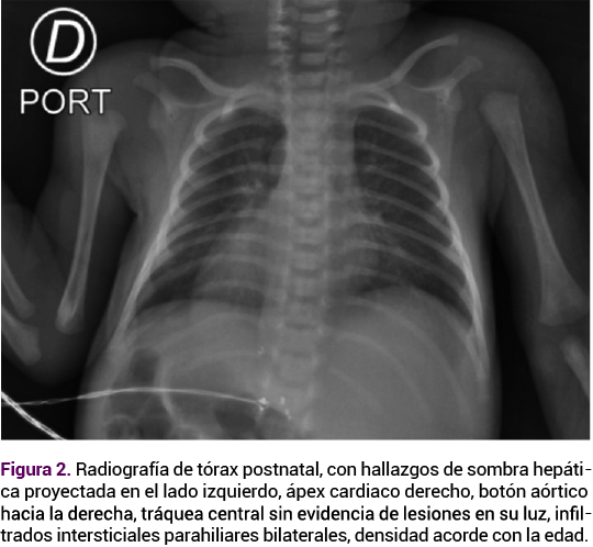 Los estudios postnatales del neonato con diagnóstico prenatal de situs inversus incluyeron una ecografía transfontanelar normal, así como una radiografía de tórax (Figura 2) y ecografía de abdomen, que confirmaron los hallazgos descritos, sin otras alteraciones, también se obtuvo el cariotipo neonatal que descartó alteraciones numéricas o estructurales en los cromosomas.