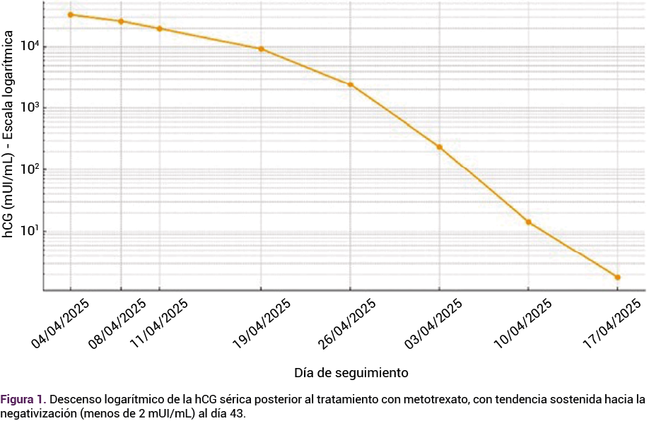Se discutieron las opciones de tratamiento disponibles, con respaldo bibliográfico actualizado, y se optó por la de metotrexato en esquema de monodosis (50 mg/m² IM), con vigilancia hospitalaria y consentimiento informado. A las 72 horas se advirtió un descenso del 21.4% en las concentraciones de hCG (25,828 mUI/mL). Si bien ese descenso fue clínicamente aceptable, se optó por aplicar una segunda dosis debido al valor inicial elevado de hCG, conforme a los señalamientos de las guías más recientes.
