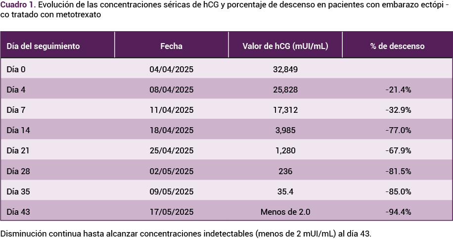 Caso clínico: Paciente de 37 años, con antecedentes obstétricos de dos embarazos y partos normales, sin abortos ni cirugías pélvicas previas, con amenorrea de ocho semanas y sin controles prenatales. Acudió a urgencias debido a un dolor hipogástrico leve e intermitente de 24 horas de evolución, acompañado de escaso manchado transvaginal color marrón. En la exploración ginecológica el útero se apreció en anteversoflexión, sin aumento de tamaño, y una tumoración anexial derecha poco definida y levemente dolorosa; el cuello uterino estaba cerrado y sin alteraciones, y no se detectaron signos de infección. Se le indicó metotrexato en esquema de monodosis (50 mg/m² IM), con vigilancia hospitalaria. A las 72 horas las concentraciones de hCG disminuyeron en 21.4%. Si bien ese descenso fue clínicamente aceptable, se administró una segunda dosis de metotrexato por el valor inicial elevado de la hCG, siguiendo las recomendaciones de las guías más actuales.
