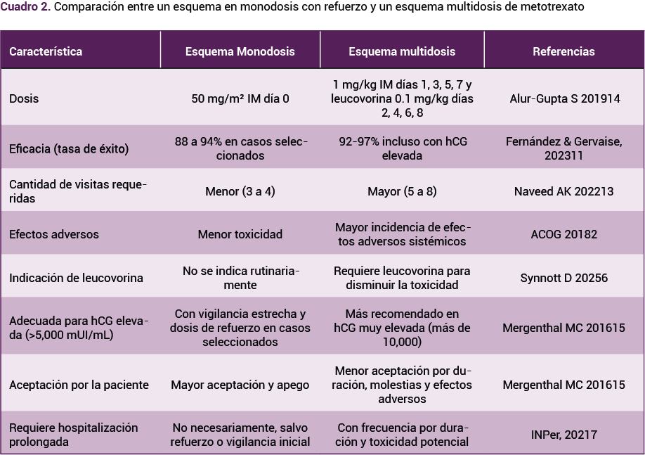 Por lo que se refiere al tratamiento, el metotrexato es una opción médica eficaz en pacientes hemodinámicamente estables, sobre todo cuando las concentraciones séricas de hCG son inferiores a 5,000 mUI/mL.12 En la bibliografía reciente se señala que, con seguimiento estricto y selección clínica cuidadosa, el tratamiento médico puede ser exitoso, incluso en pacientes con concentraciones más altas de hCG, lo que amplía las indicaciones convencionales.13