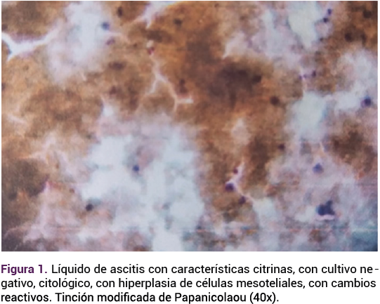 En los meses siguientes tuvo aumento del perímetro abdominal, salida de líquido de características citrinas desde la cicatriz umbilical, astenia y adinamia. El ultrasonido abdominal, practicado en un servicio privado, reportó hepatopatía difusa compatible con fibrosis, sin datos de colecistitis, con líquido en la cavidad abdominal. La paracentesis diagnóstica y terapéutica resultó con drenaje de 500 cc de líquido ascítico, con características citrinas, con cultivo negativo, citológico, con hiperplasia de células mesoteliales, con cambios reactivos, sin células neoplásicas (Figura 1).