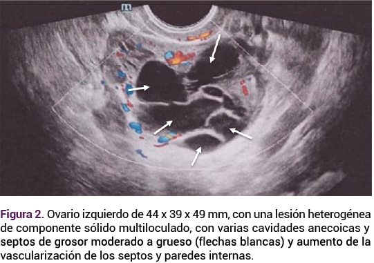 En el ultrasonido transvaginal el ovario izquierdo se observó aumentado de tamaño, con varias cavidades anecoicas y septos de grosor moderado a grueso, volumen de 45.9 cc. Al Doppler color, con evidente vascularización en los septos y paredes internas, con flujo de moderada a alta resistencia, clasificación O-RADS 4 con riesgo intermedio de malignidad (Figura 2). El ovario derecho mostró una imagen quística, con centro sólido en su interior, volumen de 28.1 cc. Serología de VIH, sífilis y hepatitis B y C negativas. La radiografía de tórax con granuloma pulmonar calcificado de 5 mm en el lóbulo pulmonar medio derecho. Figura 3
