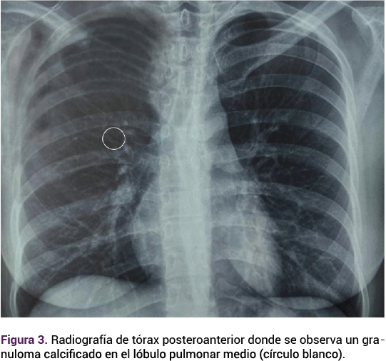 Paciente de 26 años, con antecedentes de un embarazo y una cesárea, indicada por preeclampsia sin criterios de severidad, citología reciente negativa a malignidad, consumo de anticonceptivos orales combinados en los últimos tres meses. En septiembre del 2022 acudió a su unidad de atención primaria, referida del tercer nivel para inicio del tratamiento antituberculoso. Un año antes había concurrido a una comunidad rural en donde ingirió leche no pasteurizada y carne de vaca. Convivía con su madre, diagnosticada con tuberculosis de piel.